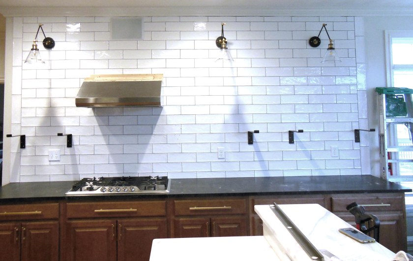So some forever long time ago I showed the countertop install, wall repairs and tile selection. The tiling itself went pretty quickly, except for the round holes we had to cut around the electrical boxes, those were a pain.