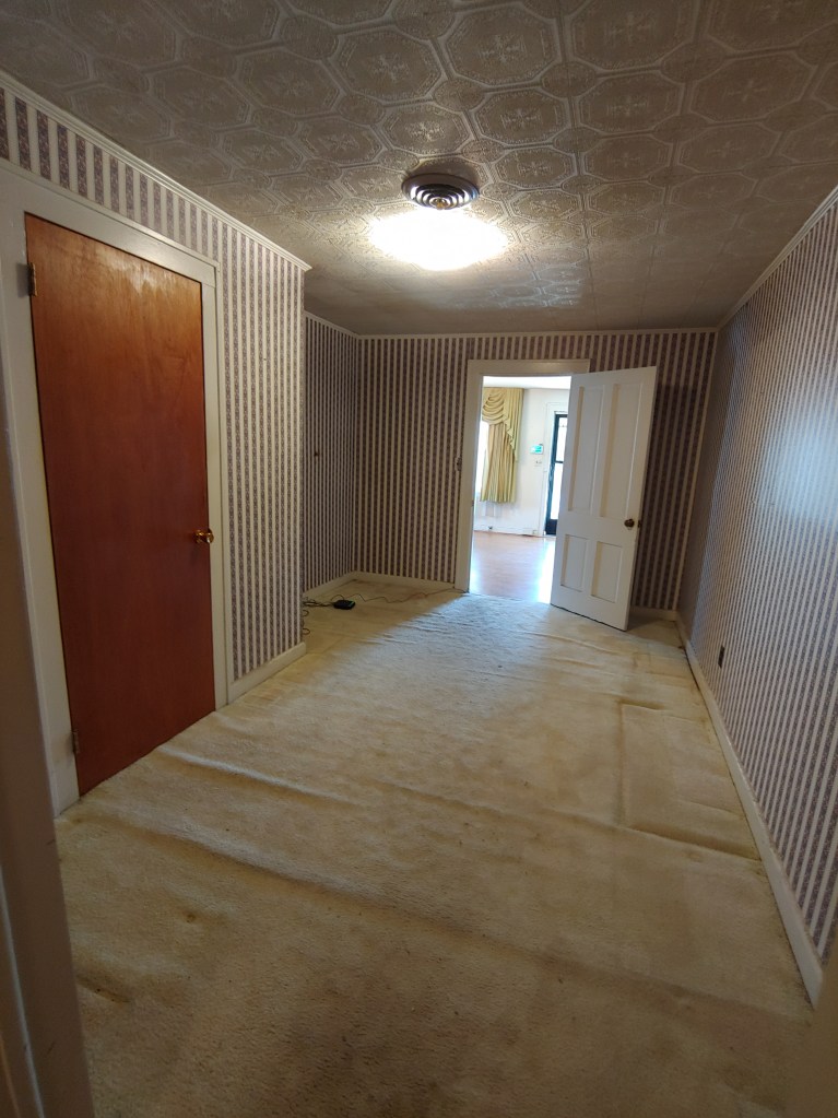 We put the question of the soft floors aside and move to the front bedroom, just off the living room. It is the smallest of the 3, but really a little paint, wallpaper removal and replace the flooring and call it a day! No flooring issues here thank goodness!!