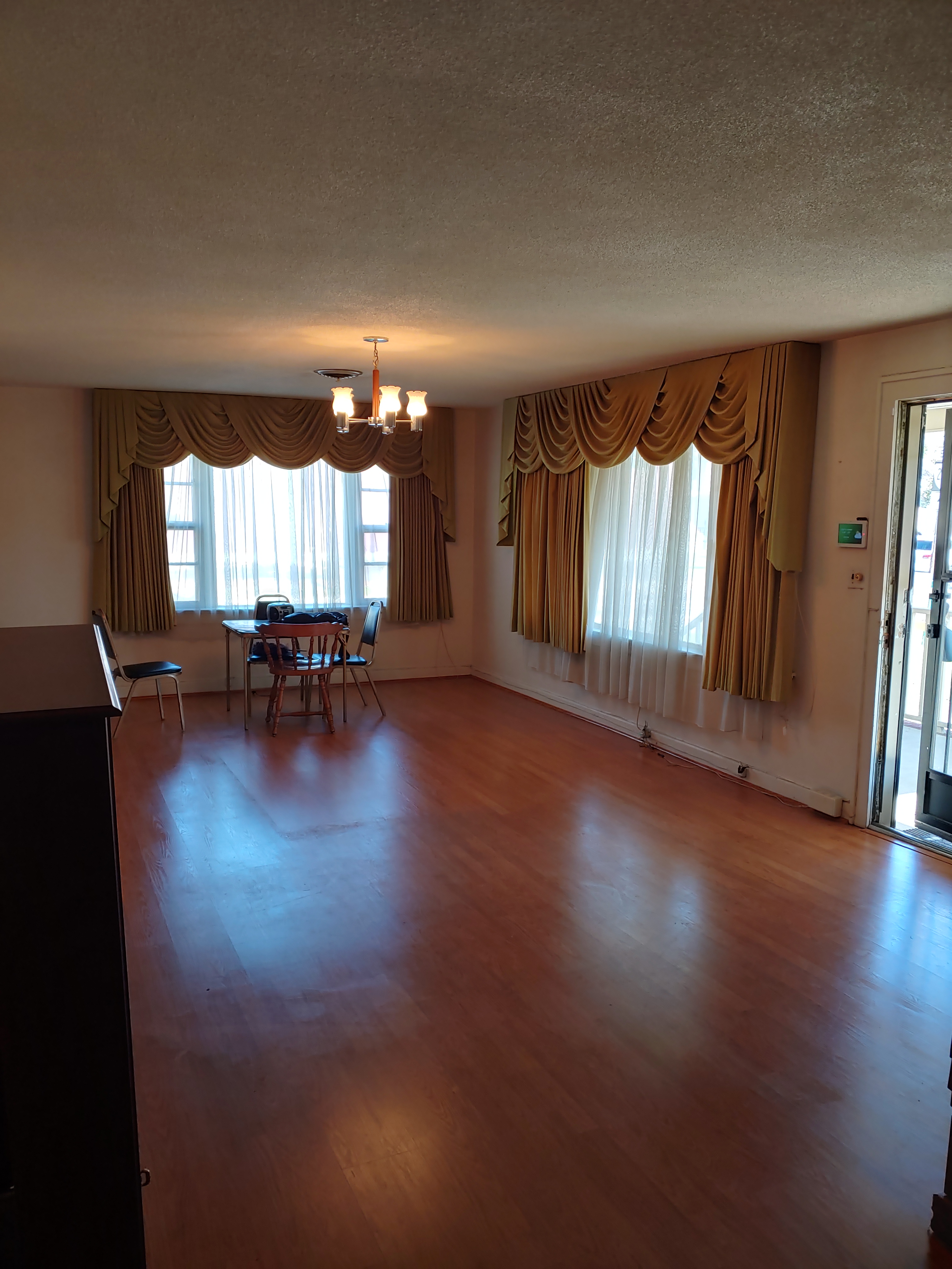 Not too bad right? Those curtains were custom made and when made ( a long, long time ago) must’ve been very expensive, they’re pretty incredible. The floor is an inexpensive laminate wood look, but not too bad. The ceiling has a popcorn finish and the walls has a scallop texture to them, still not too bad…