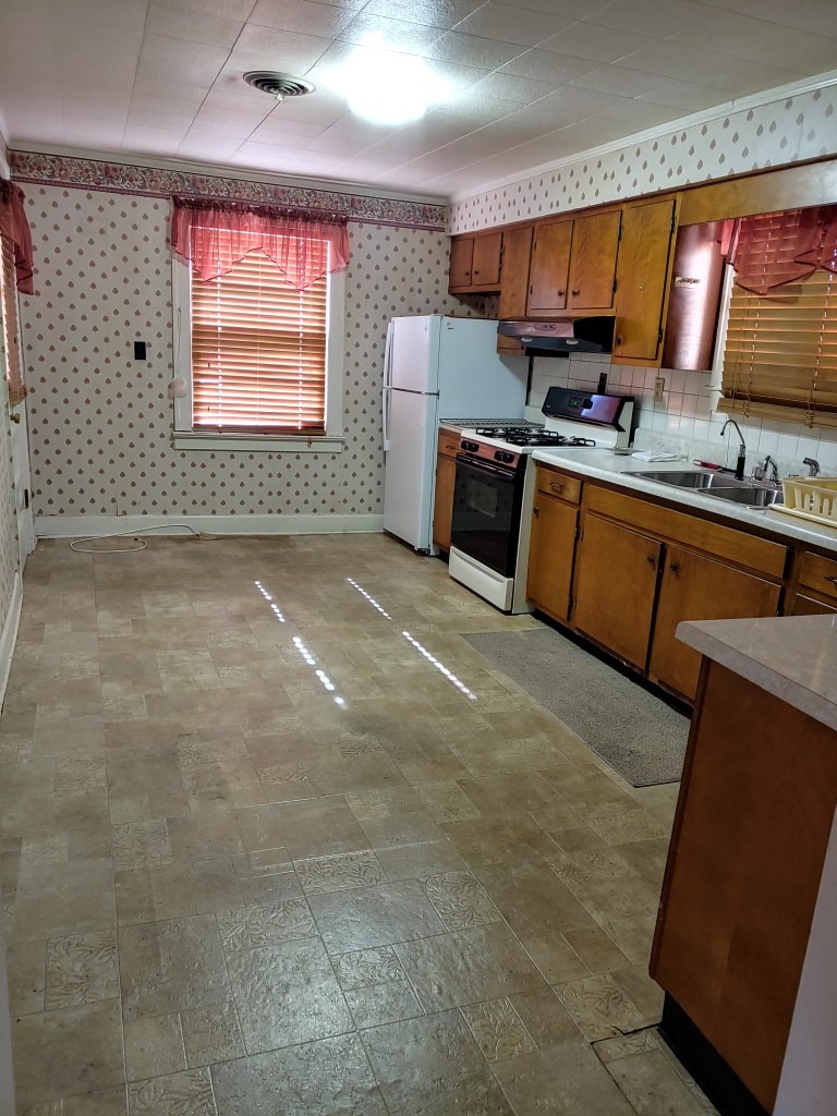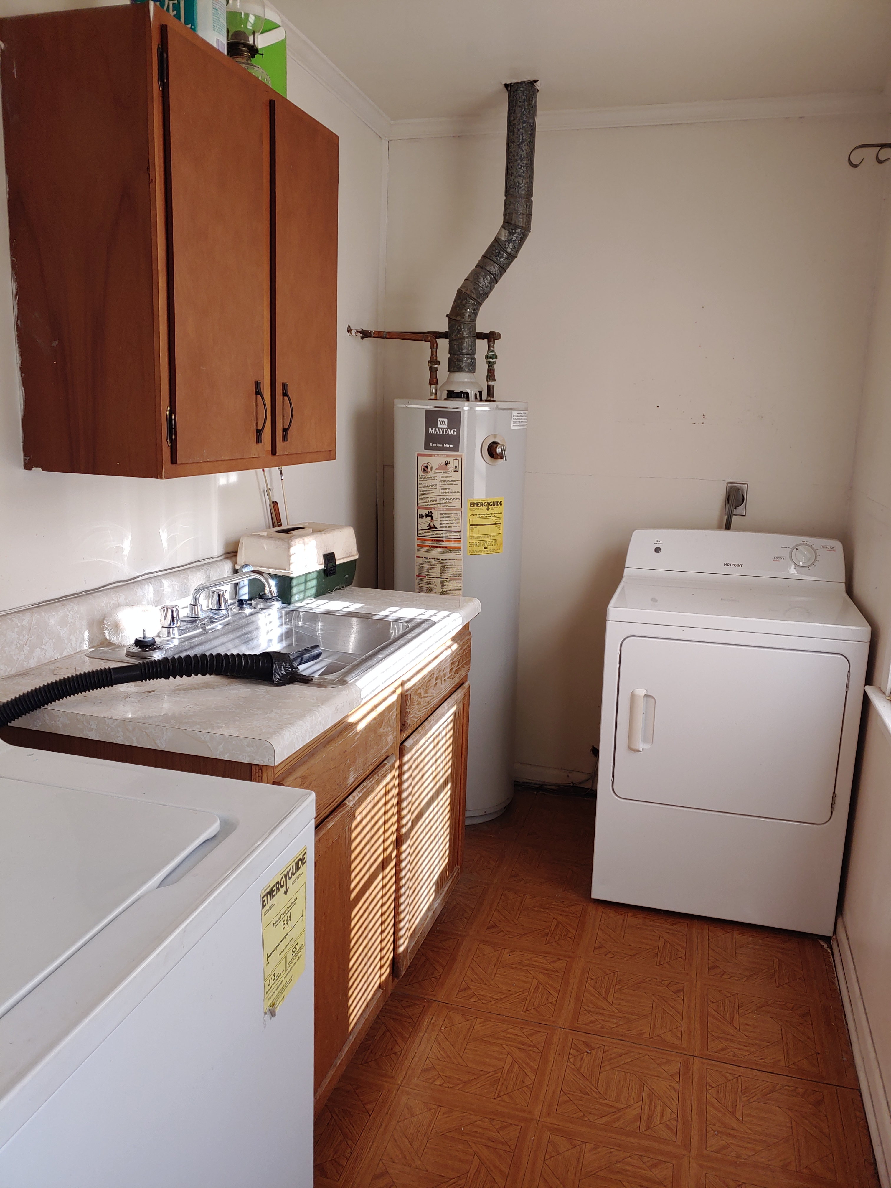 This is the mudroom, which is located just off of the kitchen and allows access to the back deck and yard. It is a good sized room, but had some sort of issues with the washer draining into the sink, but overall looked like just cosmetic work warranted.