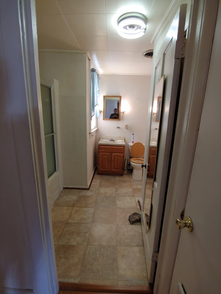 This is the main bath, again a little paint, new inexpensive flooring, no problem! Nope, don’t get too close to the vanity or toilet or you might fall through that floor, OMG what is happening!
