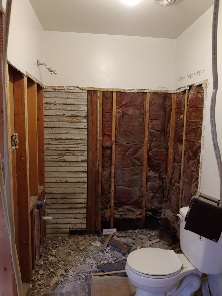 Removing the tubs were no joke (or so I was told by my Hubby) they were cast iron and he basically beat them out, utilizing a Sawzall some of the time. We had to get under these tubs so salvaging them was not an option. This section of the house is an addition, so what you see to the right side of the photo is the original clapboard siding that they left when they added the addition.