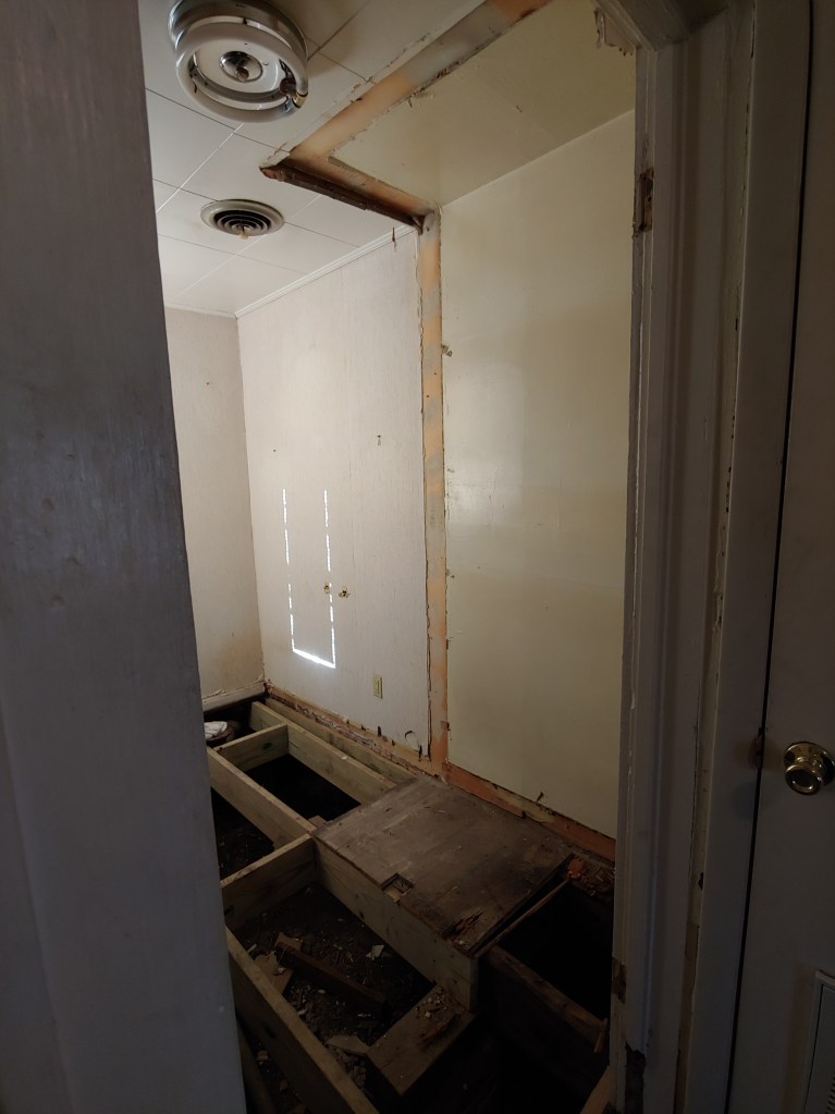 Our contractor had started removing the old joists and installing new ones at this point. With the floor open like this I could see that there was water coming in from the HVAC unit’s outside piping every time it rained, like it was just running down the pipe… good times!