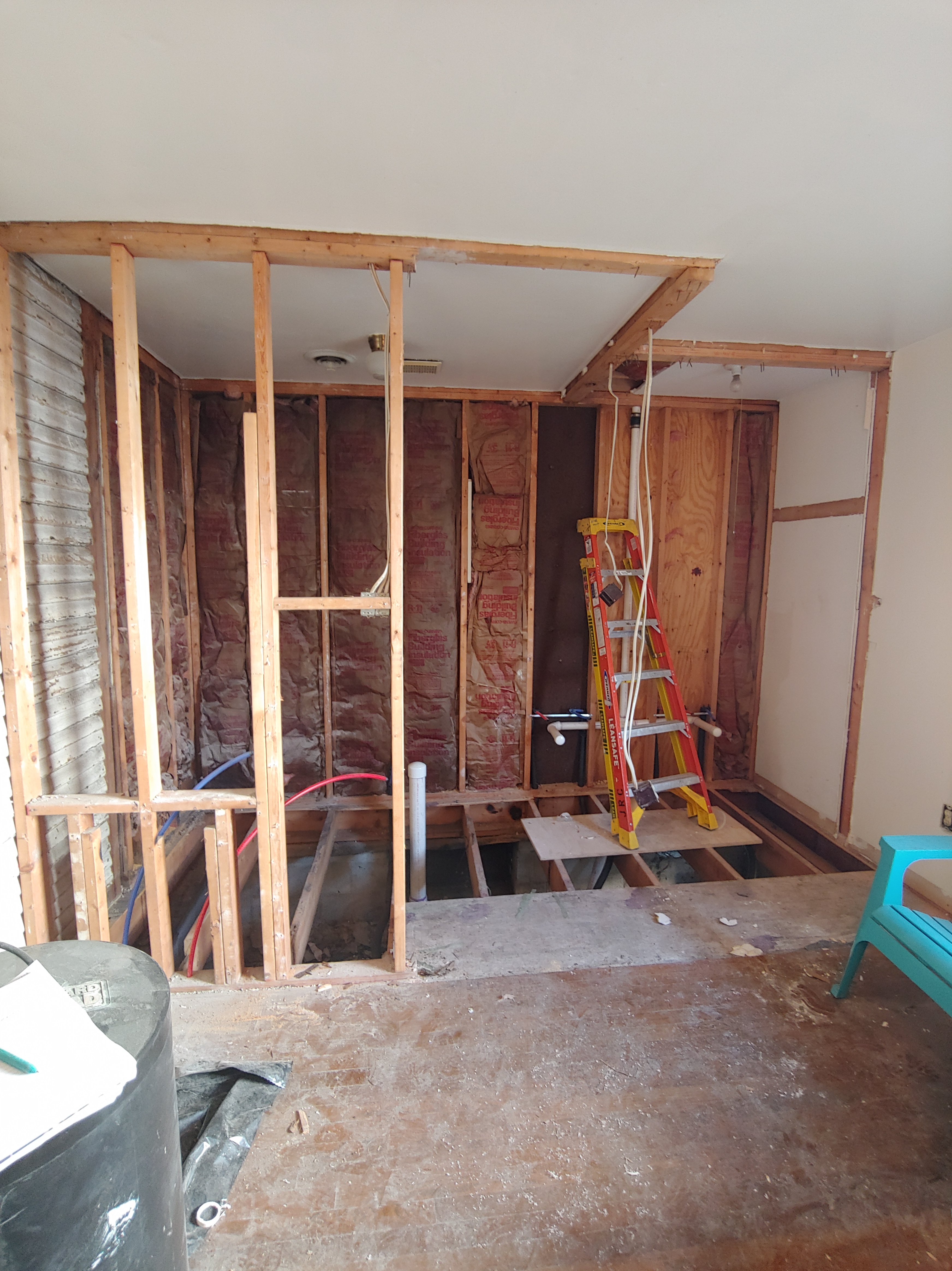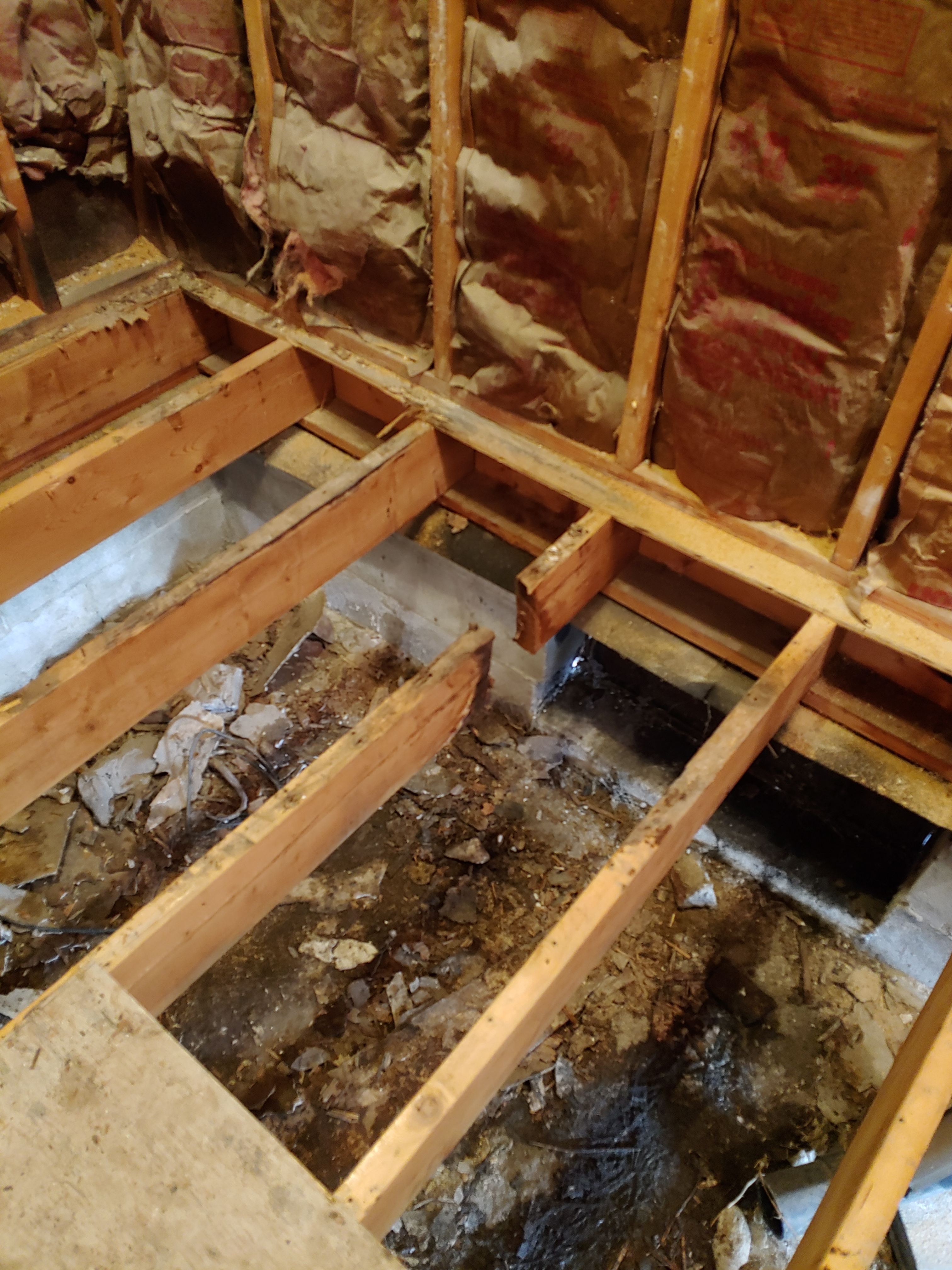 Our contractor had started removing the old joists and installing new ones at this point. With the floor open like this I could see that there was water coming in from the HVAC unit’s outside piping every time it rained, like it was just running down the pipe… good times!