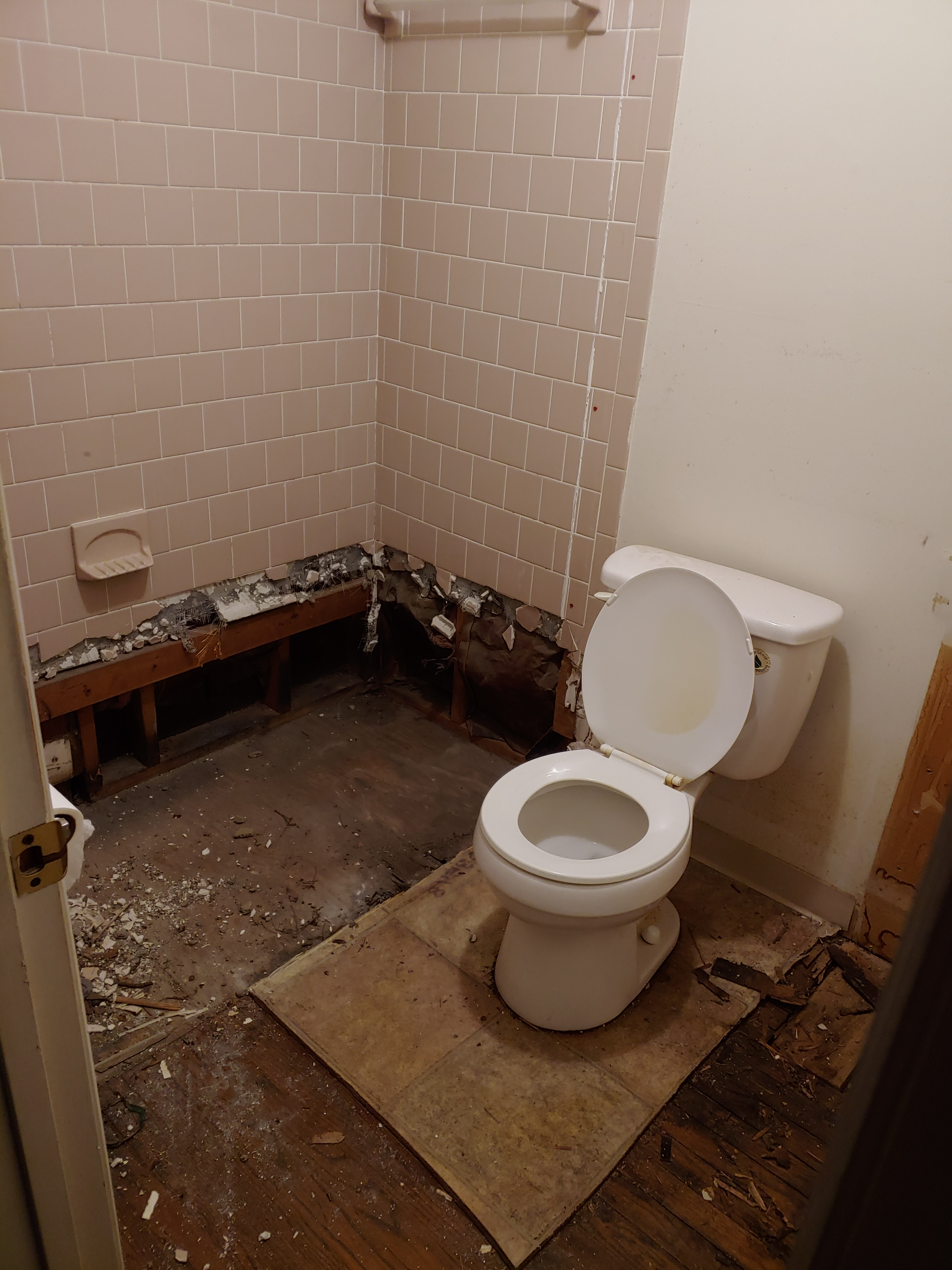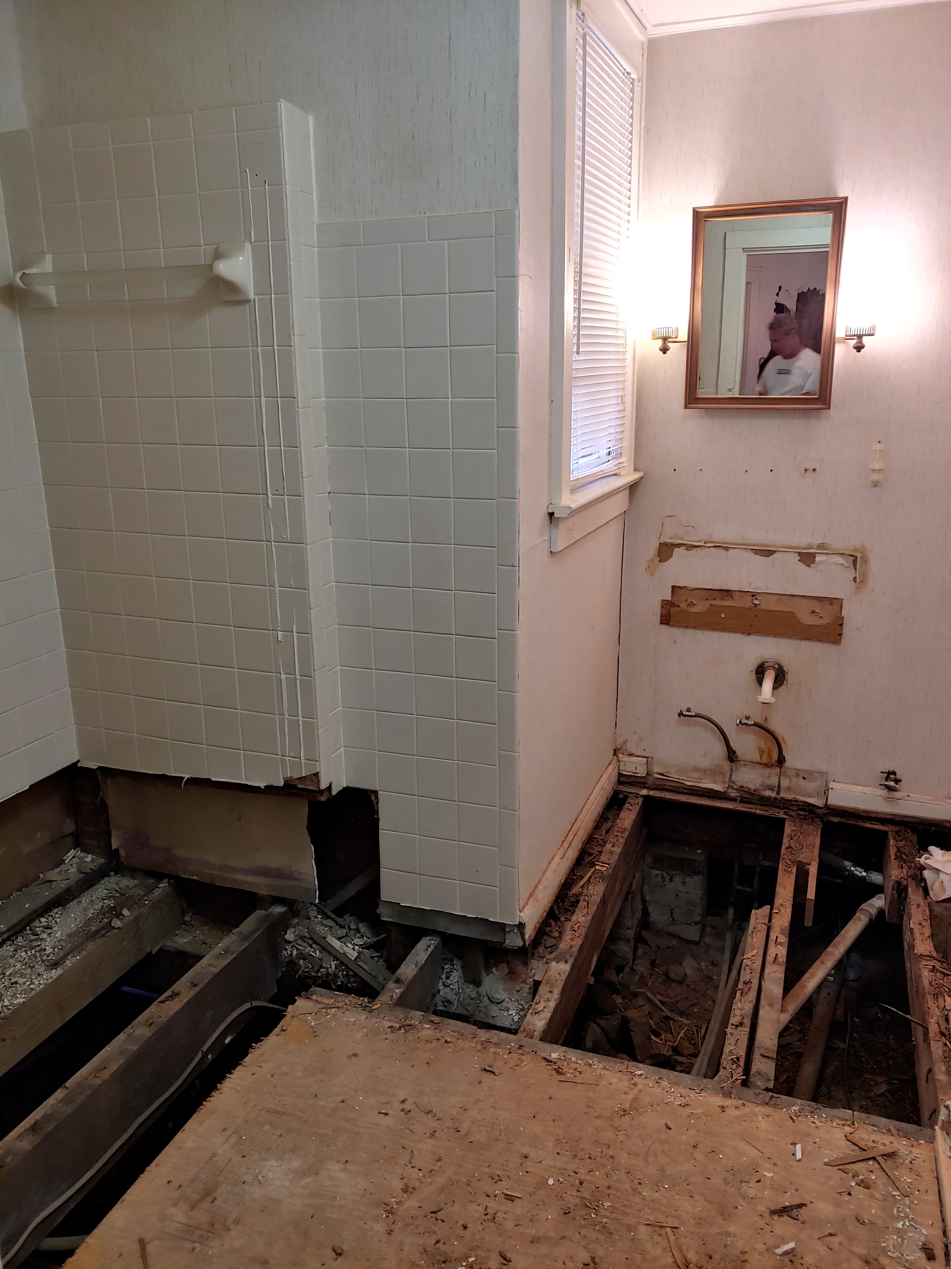 One of the BIGGEST issues we had in the house was termite and water damage, which we were aware of and had a budget for prior to purchasing the house. The budget was about $7k for the contractor to replace something close to 15 joists, some 48ft of sill beam, treat for termites and demo the 2 bathrooms. I asked the contractor to breakout the demo of the 2 bathrooms in his quote, as I knew that my Hubby and I could handle that, and that part of the quote was $2,000!