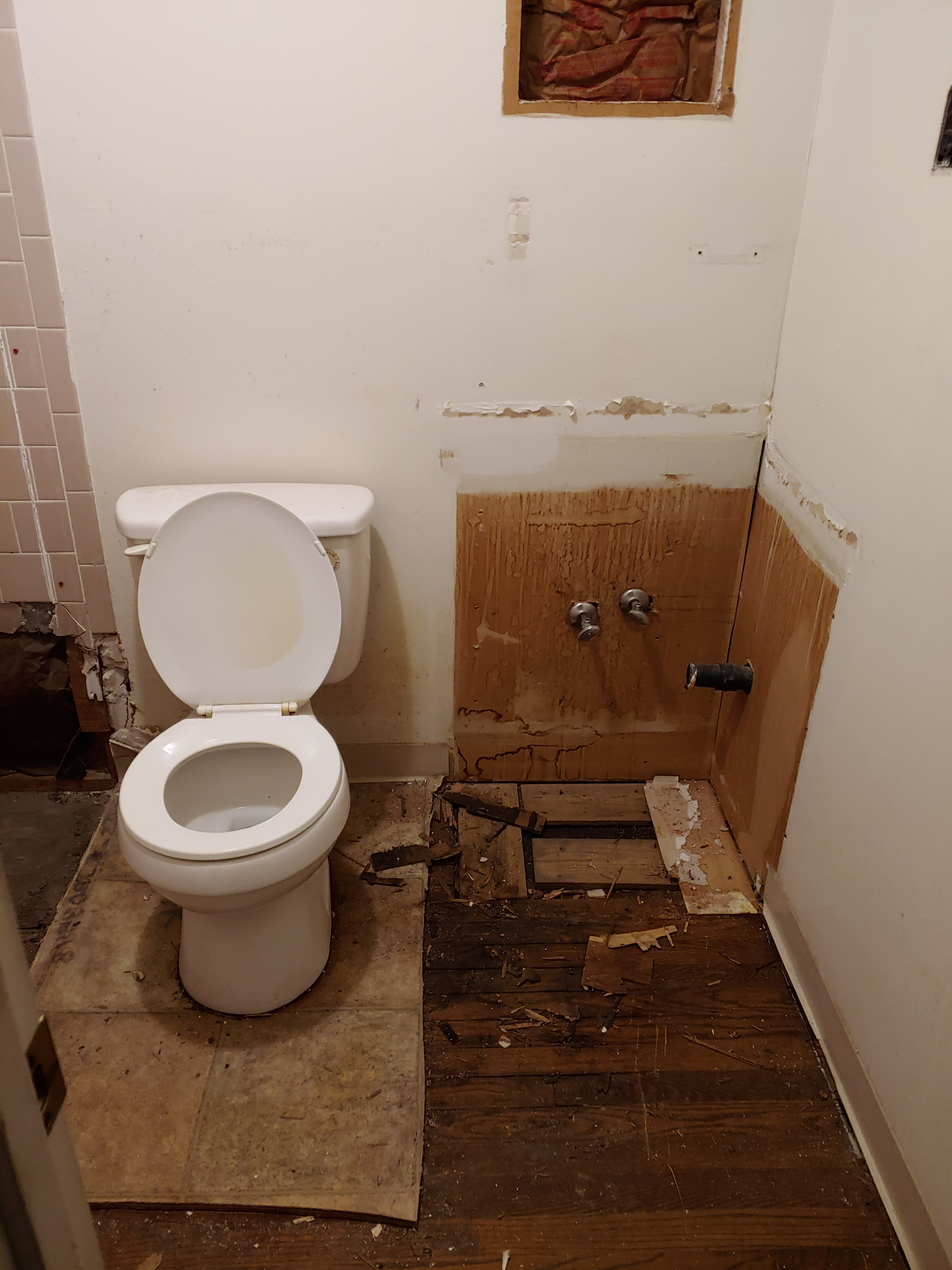 I discussed the removal of the flooring, wallpaper and ceiling tiles in my last post, which in all honesty was probably some of the easiest demo, now we move on to the bathroom demo…