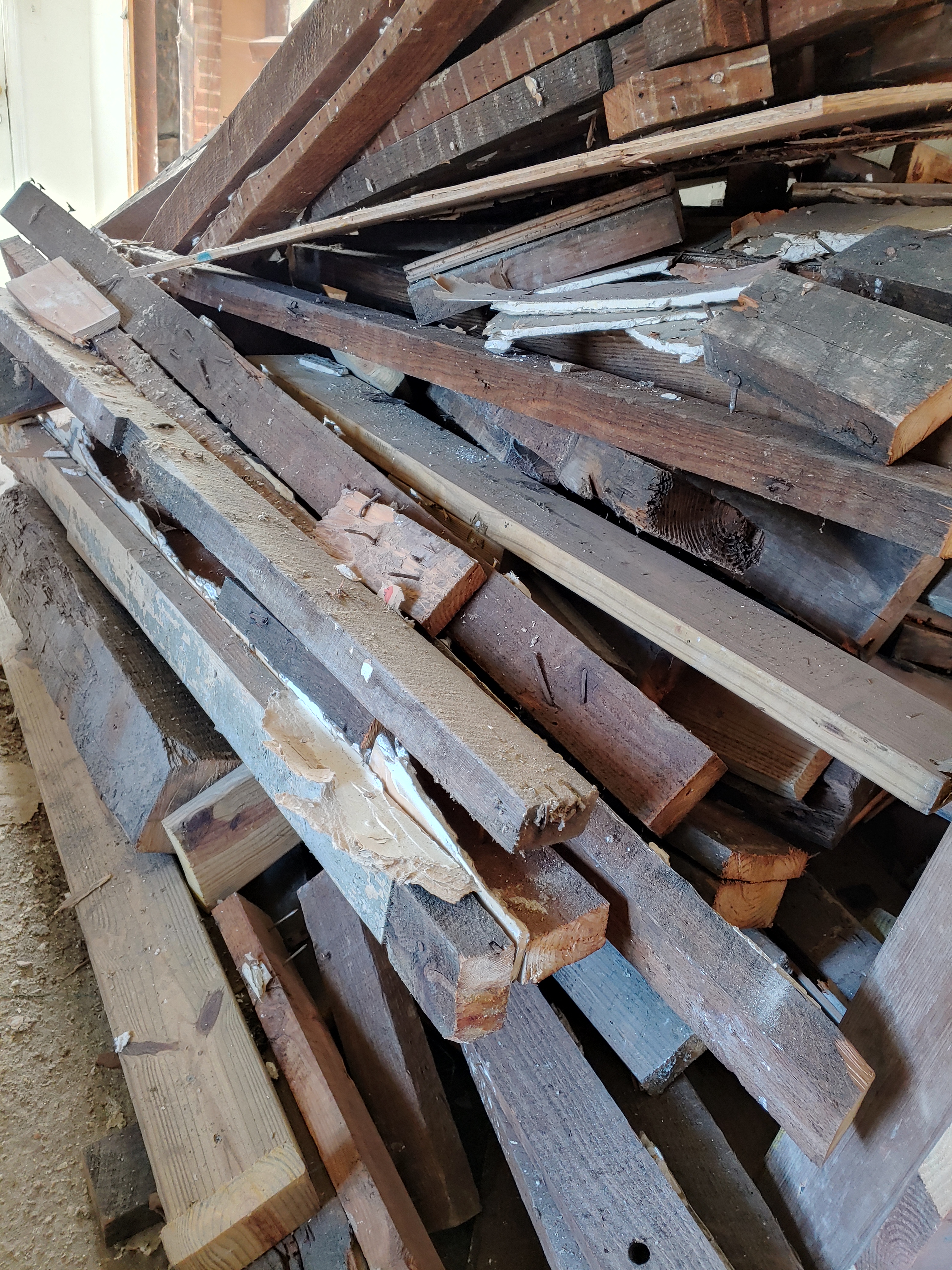 Not sure if I mentioned this before but none of the walls we removed were plaster. You can see that at one time they were plaster as the remnants of lathe shadows were still visible. However the studs in the original part of the house are all 130 year old legit 2×4’s, which are no joke as they are very hard and very heavy compared to studs these days. Any of the wood that was removed we piled in one area, at one point I was hoping to use it to make countertops… that just didn’t fit into our timeline, but I did list it for free on NextDoor.