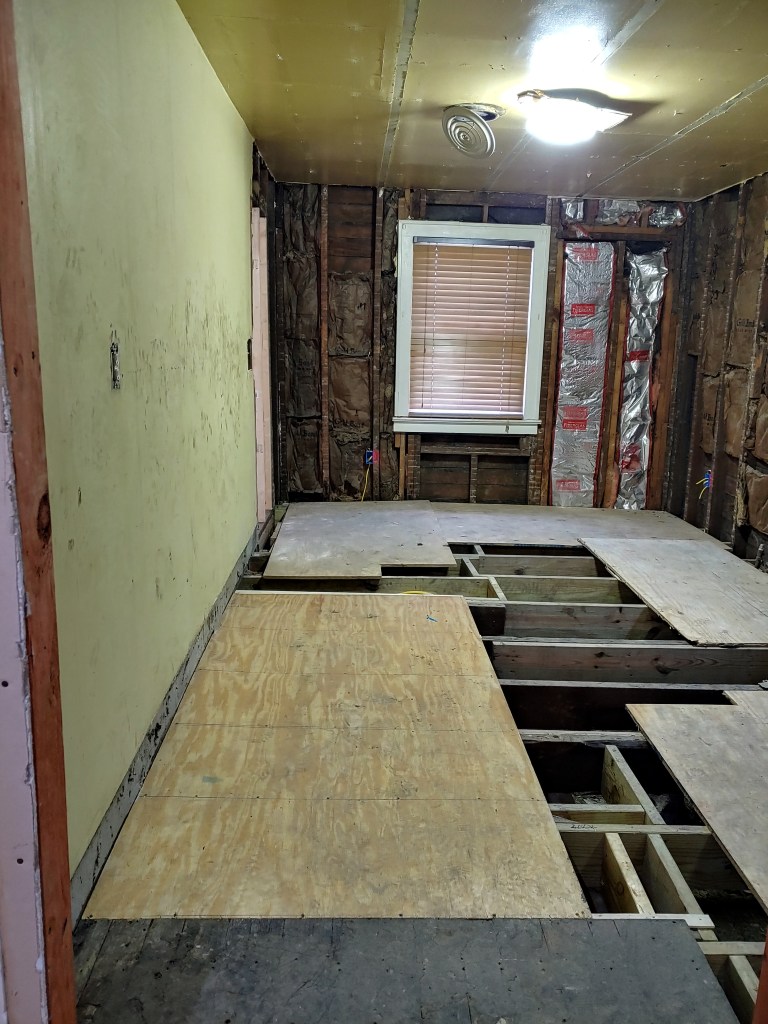 All of the flooring from the kitchen, two bathrooms and a spot here and there had to be removed due to rot. We had a contractor come in and replace the rotten joists etc. so we could install the new subflooring.